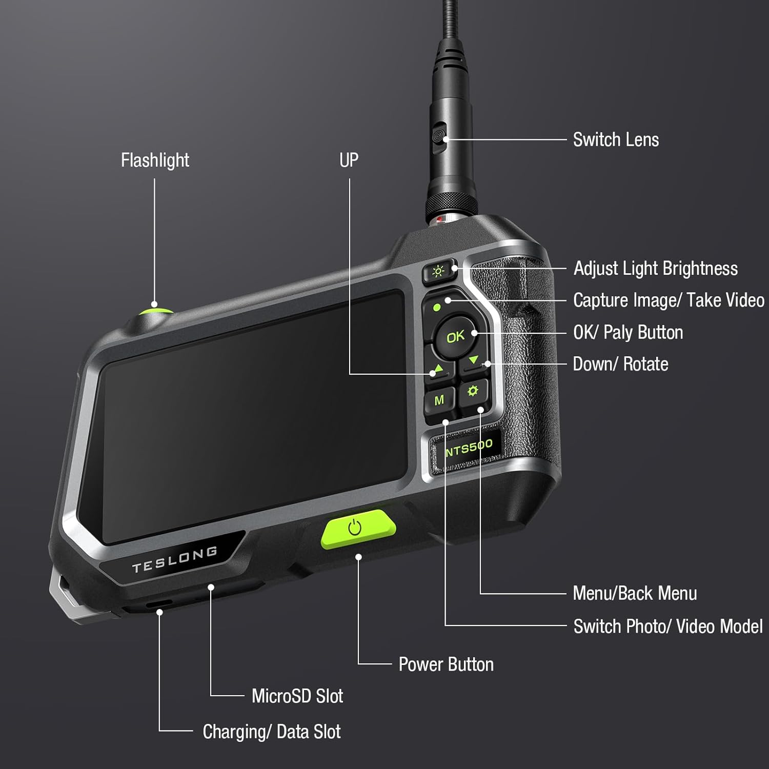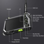 - Fits for Working In The Dark – Six LED lights are adjustable for brightness and give the forward camera a perfect view of the darkest inspection areas. The side camera has its own LED illumination. With flashlight and backlight buttons, the endoscope is perfect for working in the dark